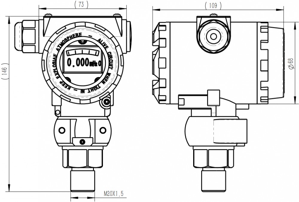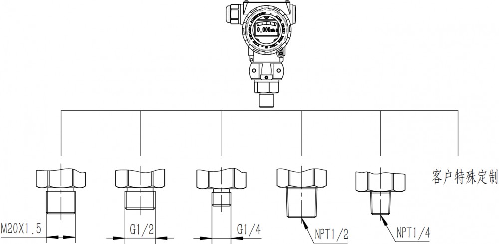 Product Introduction: Suitable for: Pressure measurement of gases, liquids, and fluid media in industries such as Heat Exchange Station, Constant Pressure Water Supply, Vacuum Equipment, Natural Gas Installation, Gas Boiler, Central Air Conditioning Unit, etc. Features: Compact size, easy installation, analog output signal, low-cost economical type, modular design, 1-year warranty provided, 4.5-digit LCD display head. Performance Parameters: Measuring Range: -100 - 0 KPa / 0 - 100 MPa Power Supply: 12.5-36VDC Output Signal: 4-20mA Process Connection: M20X1.5 external thread, G1/2 external thread, G1/4 external thread, NPT1/2 external thread. Other process connections available upon request, customer must provide standard and drawings. Full Scale Accuracy: 0.1% F.S, 0.25% F.S, 0.5% F.S Temperature Range: -20 to 85°C Protection Rating: IP66 Explosion Proof Rating: Exia IICT4 and Exia IICT6 Electrical Connection: M20X1.5 internal thread Over pressure Limit: 1.5 times full scale Burst Pressure: 3 times full scale Housing Material: Low-copper aluminum casting Filling Fluid: Silicone Oil Paint Color: Blue-Grey two-tone high-adhesion polyester paint, durable, non-cracking, non-fading Diaphragm Material: 316L stainless steel, Hastelloy C-276, Monel, Tantalum |