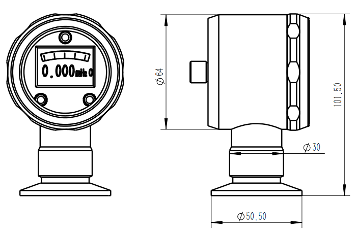 Measuring Range: -100 - 0 KPa / 0 - 6 MPa Power Supply: 12.5-36VDC Output Signal: 4-20mA / 4-20mA+HART / RS485 RTU Process Connection:Φ50.5 clamp. Other process connections customizable, customer must provide standard and drawings. Full Scale Accuracy: 0.1% F.S, 0.25% F.S, 0.5% F.S Temperature Range: -20 to 85°C Protection Rating: IP67 Electrical Connection: M12X1 quick 4-pin connector Over pressure Limit: 3 times full scale Burst Pressure: 6 times full scale Filling Fluid: Silicone Oil Housing Material: 304 stainless steel Diaphragm Material: 316L stainless steel, Hastelloy C-276, Monel, Tantalum |